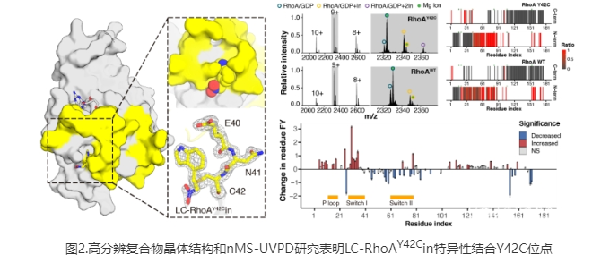 在本研究中,团队利用非变性质谱(nMS)与紫外激光解离技术(UVPD)打破了这一瓶颈,晶体学研究得到了两种不同的静态结构,而nMS-UVPD以单氨基酸的分辨率,证实了Pro36骨架羰基配位是该突变体在溶液中的主导状态。研究揭示,Y42C突变增强了蛋白对Mg2+的亲和力,形成了独特的“Mg2+锁定效应”。同时,Switch I区域的构象改变导致关键水分子丢失,致使GTP水解能力受损;而局部疏水相互作用的破坏使Cys42附近柔性显著增加,在三维空间形成了一个隐藏的新口袋(Cys42/Switch I口袋)。据此,团队筛选出原型共价抑制剂LC-RhoAY42Cin,该抑制剂能选择性修饰突变体Cys42位点,并呈剂量依赖性地抑制核苷酸交换