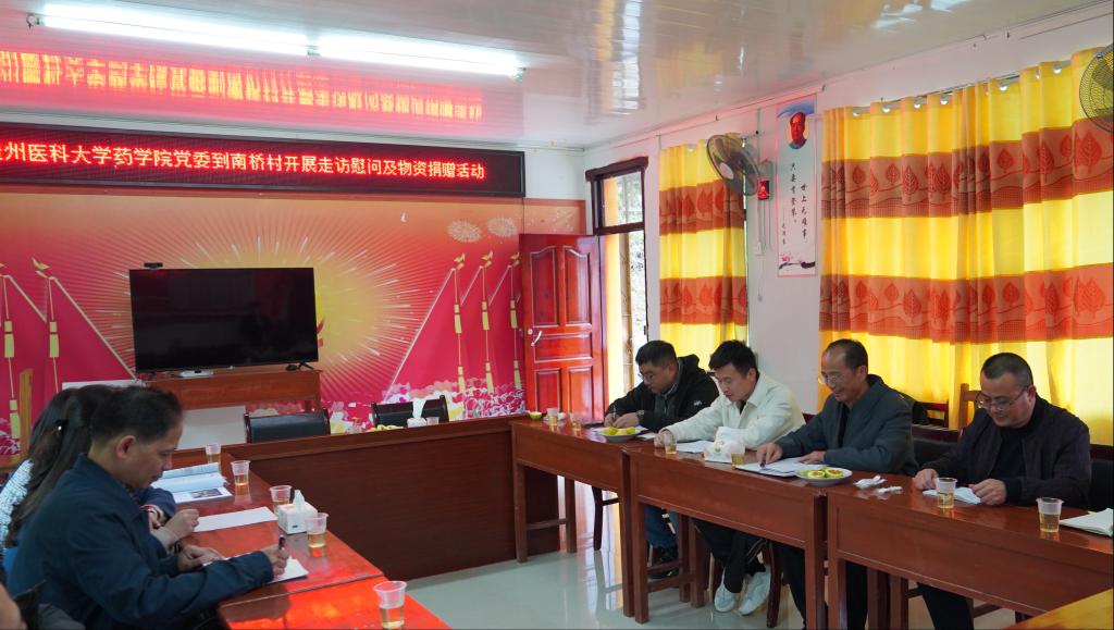 下午,在南桥村委会会议室,药学院党委与南桥村支两委开展交流座谈。会上,南桥村负责人详细介绍了村里的基本情况、产业发展现状、基础设施建设以及当前面临的困难和挑战。随后,药学院驻南桥村“第一书记”王垚汇报了驻村以来的工作开展情况,包括乡村振兴规划实施、特色产业培育、民生实事办理、基层党组织建设等方面的进展和成效,以及工作中遇到的问题和下一步工作计划。药学院党委对王垚、陈帅帅两位第一书记的驻村工作给予了充分肯定。李勇军表示,第一书记扎根基层、履职尽责,为南桥村的发展付出了大量心血,取得了显著成效,展现了药学院党员干部的良好风貌。同时,针对南桥村提出的发展需求,药学院党委将充分发挥自身专业优势和资源优势,在人才培养、技术支持、产业对接等方面给予更多的帮助和支持,助力南桥村高质量发展。双方还就如何进一步加强校地合作、推动乡村产业振兴、提升村民健康意识等话题进行了深入交流和探讨。