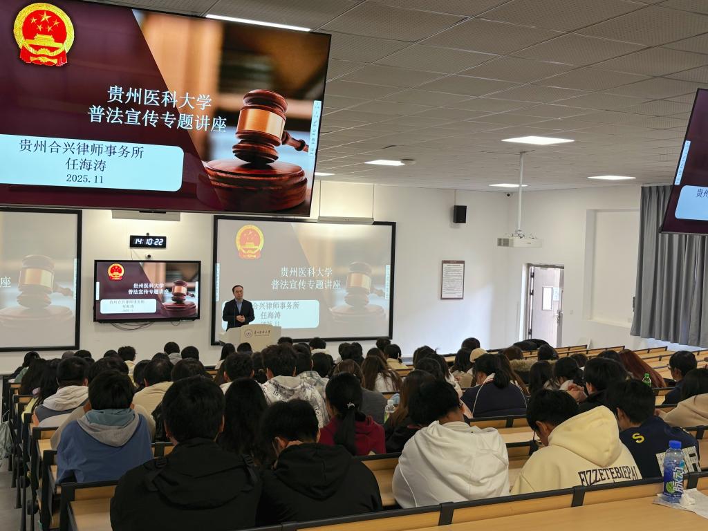 为全面提升师生法律素养,培养法治思维,有效预防在学术研究、日常生活及未来求职过程中可能面临的法律风险,2025年11月14日,药学院在致知楼L108教室成功举办了法律宣传讲座。本次活动特邀贵州合兴律师事务所任海涛律师担任主讲。药学院党委副书记包欢欢主持活动。