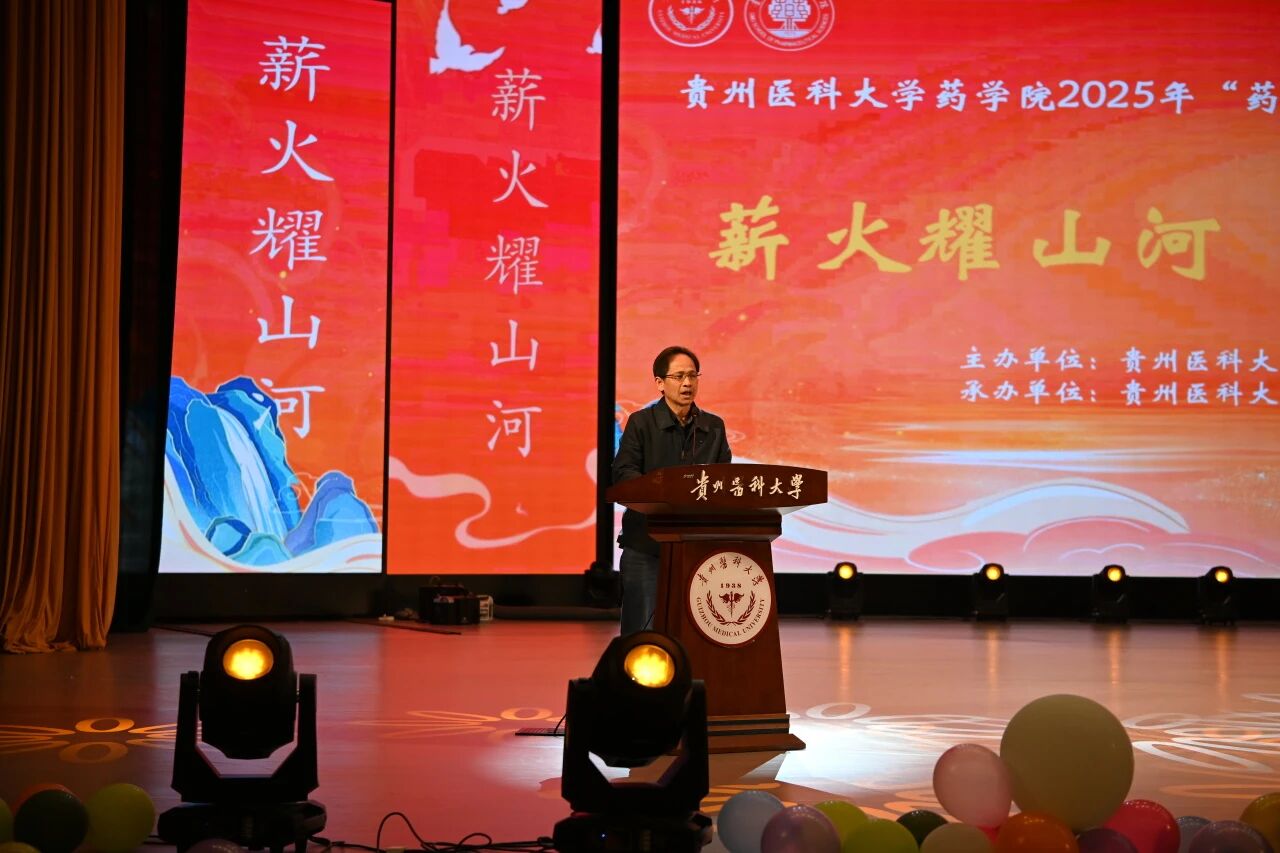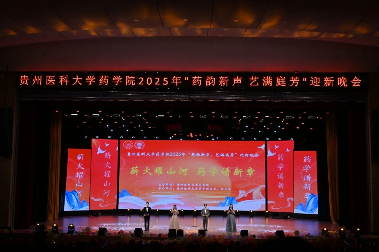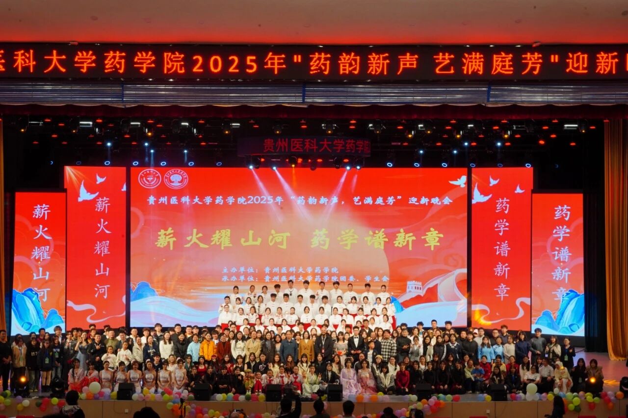 正值中国人民抗日战争暨世界反法西斯战争胜利 80 周年纪念之际,10 月 24日晚,贵州医科大学药学院 “薪火耀山河,药学谱新章” 迎新晚会在云漫湖校区礼堂盛大举行。晚会以丰富多元的节目形式,不仅为 2025 级新生送上了一场青春盛宴,更通过红色主题演绎,传递历史记忆与家国情怀。药学院执行院长李勇军,学生处副处长金晶、贲琛,药学院党委副书记包欢欢,副院长廖尚高、陈妍,还有校团委以及来自马场镇中心小学的师生和药学院全体师生欢聚一堂,共赴这场视听盛宴。