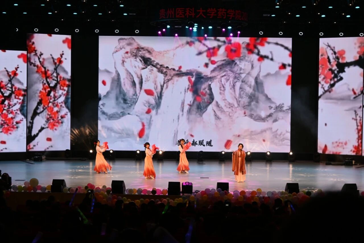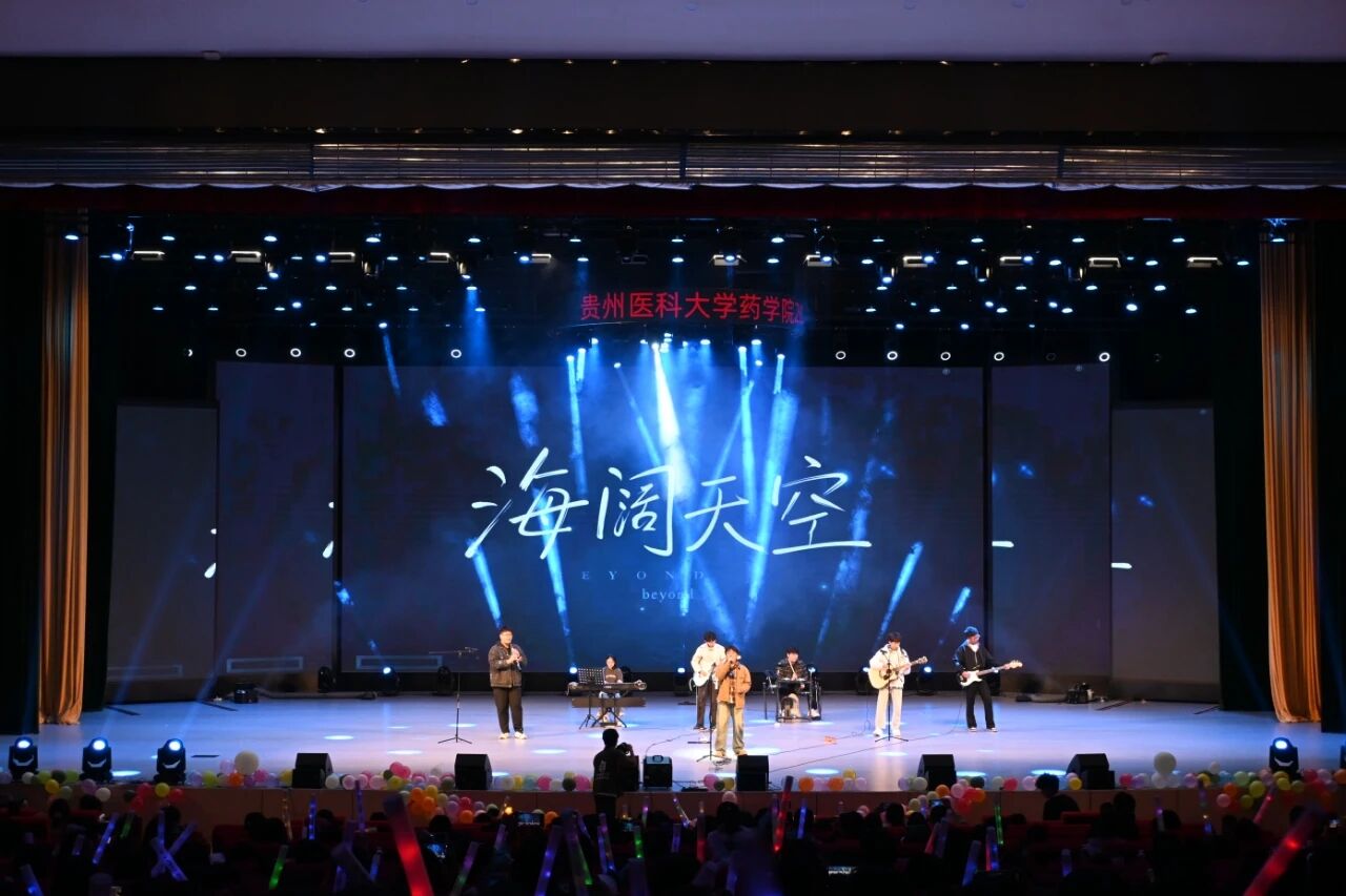 由乐队演绎的《海阔天空》更点燃全场师生的共同记忆与追梦热情,熟悉的旋律响起时,台下师生纷纷跟唱,高潮迭起。语言类节目聚焦现实需求与专业特色。小品《请你阻止我》以幽默剧情揭露网络贷款刷单陷阱,将 “防诈教育” 融入表演,为新生筑牢安全防线;情景配音《我在贵医的一天》通过还原课堂、实验室等场景,让新生直观了解大学生活;相声《满汉全席贵医版》则巧妙结合药学知识,以趣味段子展现专业学习的 “苦与乐”,缓解新生学业焦虑。此外,晚会穿插的抽奖、互动游戏环节,进一步拉近师生距离,现场氛围多次达到高潮。
