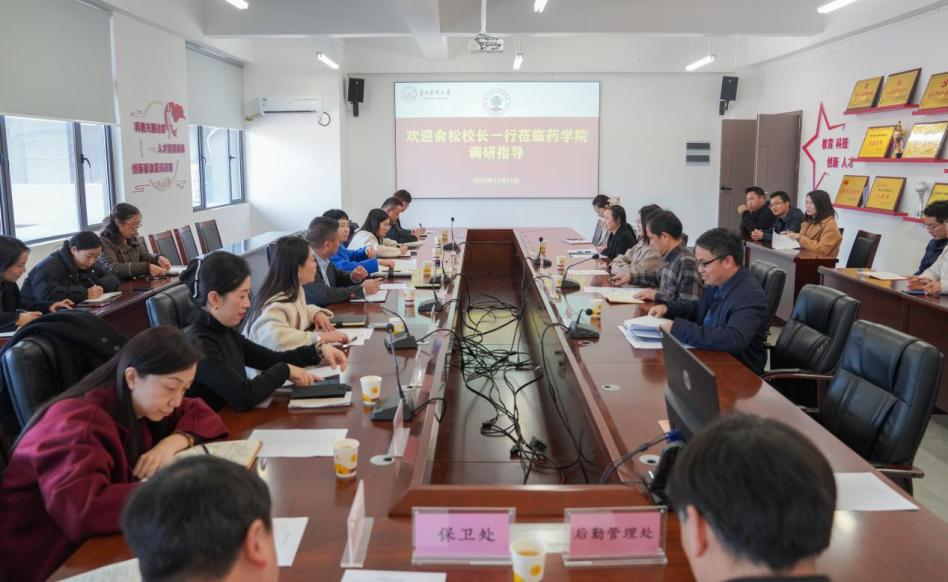 12月12日,校党委副书记、校长俞松,校党委常委、副书记张洁一行到药学院围绕学院高质量发展进行专项调研指导。党政办公室、人事处、教务处、科学技术处、学生处、计划财务处、设备处、后勤管理处、保卫处等职能部门负责人,药学院党政领导班子成员及副科级以上干部(含教研室负责人)参加调研座谈会。会议由校办公室主任龚敏主持。